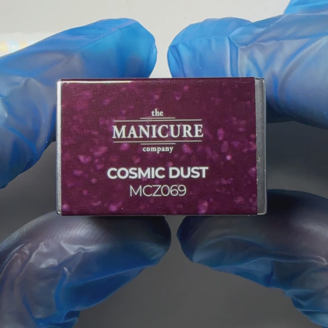 Zero Gel Polish® in the shade Cosmic Dust is a stunning dark purple base full of silver micro glitter that flashes under light.
