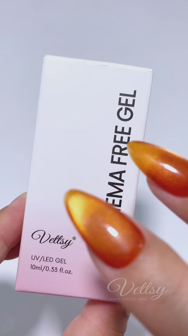 Infuse your fingertips with the breathtaking glow of golden hour with Vettsy Hema-Free Fruit Glaze Cat Eye Gel-FG02. This vibrant tangerine amber captures the warmth of a sunlit orchard, delivering a juicy pop of color that looks like glowing liquid amber on your nails. Designed to help you achieve the viral "glass bead" cat eye trend in record time, this innovative formula flawlessly blends a translucent jelly tint with ultra-fine magnetic shimmers. Say goodbye to the frustrating hassle of layering sheer colors over a silver cat-eye base! FG02 gives you a sweeping velvet illusion that is completely free of bulky thickness. Proudly Hema-free, 100% vegan, and cruelty-free, this stunning amber-inspired shade delivers an effortless, radiant sparkle while keeping your natural nails safe.🍊
